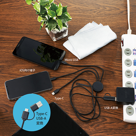 様々な形状の端子に対応する充電ケーブル。