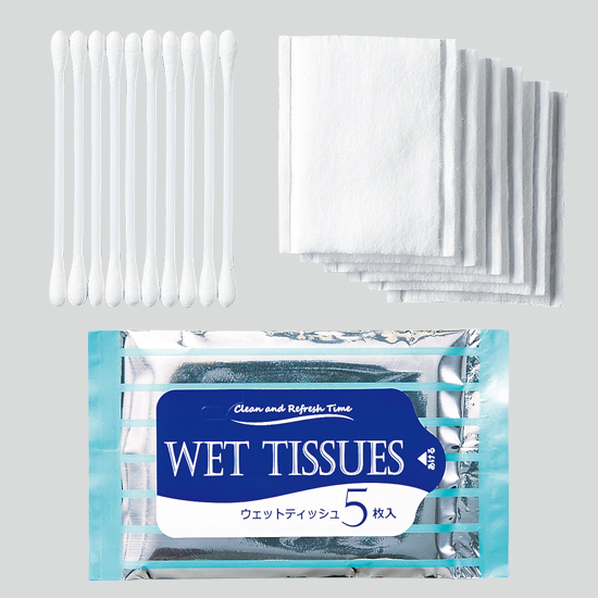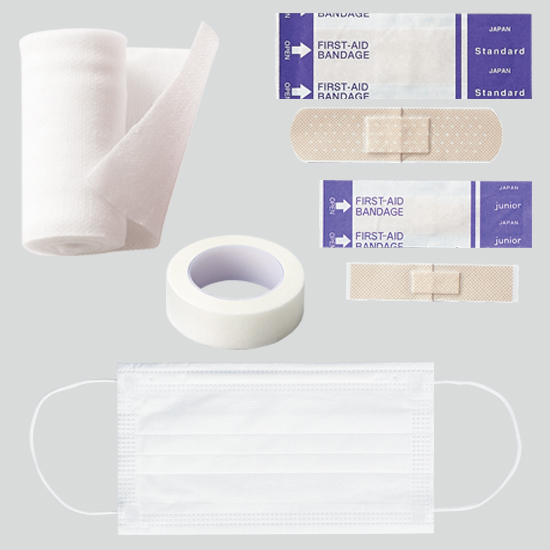 ウェットティッシュや包帯などの必需品が揃う。