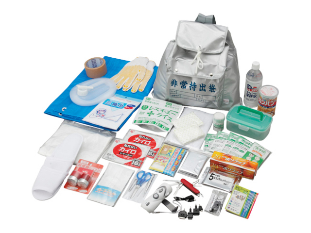 | セット内容 | リュック型非常袋(約400×420×80mm)×1、折りたたみウォーターバッグ3L・タオル・すべり止め手袋・防災用ウエットティッシュ(20枚入)・ゴミ袋45L(10枚入)・防寒シート・ミニダイナモラジオライト・ホイッスル・ブルーシート2畳用・非常用ローソクセット・ポリラップ(15cm×20m)・万能ナイフ・カンパン(約100g)・保存水(約500ml)・救急箱・ガーゼ(3枚入)・包帯・カット綿(3枚入)・救急絆創膏(2サイズ×3枚)・サージカルテープ・清浄綿(2枚入×3包)・ハサミ・ピンセット・毛抜き・緊急簡易トイレ袋・耳かき・レスキーライス(白米)・三角巾・スリッパ・布テープ・防災コンパクトガイド×各1、マスク・カイロ・ポケットティッシュ×各2 |