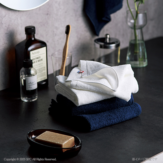 清楚な白とシックなネイビーを組み合わせた高級感あふれる今治タオルが優しく肌を包み込んでくれます。