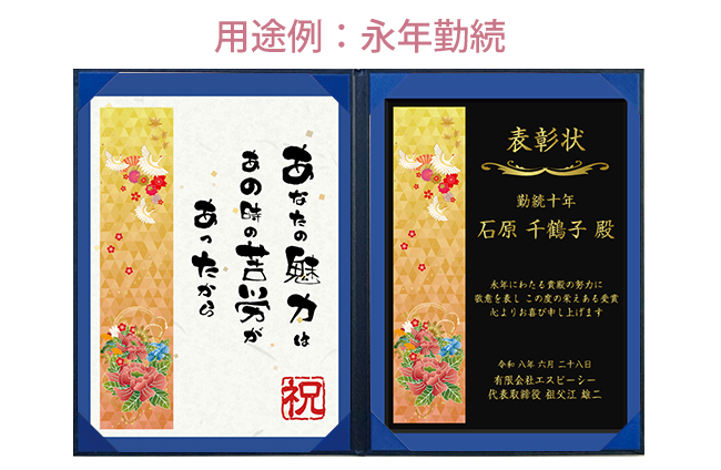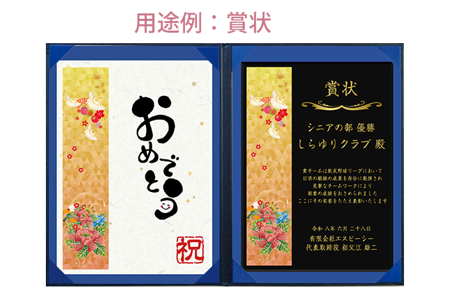 証書(賞状)を差し込むコーナーも証書が映える紺色の布地を使用し、気品がある仕様となっています。