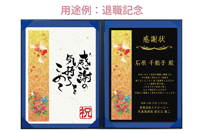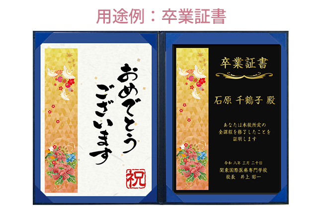 | サイズ | 本体:A4サイズ証書(210mm×297mm)×2、パッケージサイズ:450mm×310mm |