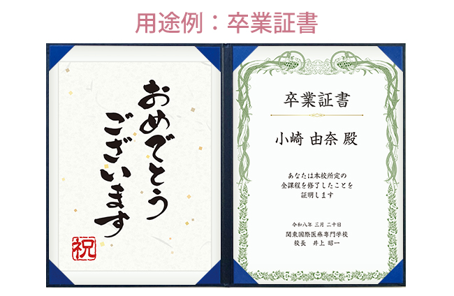 | サイズ | 本体:A4サイズ証書(210mm×297mm)×2、パッケージサイズ:450mm×310mm |