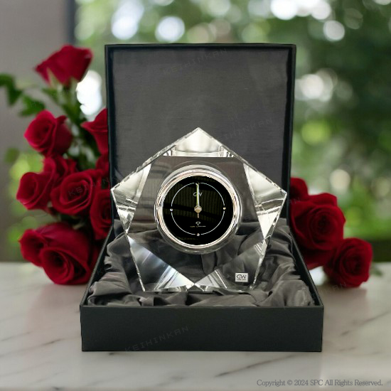 本体が透明なガラスクロックは、それらの部品を時計枠内に収める必要がありました。